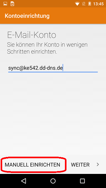 6) Geben Sie die Email Adresse ein, welche im AkrutoSync Fenster auf Ihrem Computer angezeigt wird (nicht Ihre wirkliche!) und tippen Sie “Manuell Einrichten”.