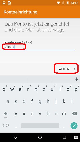 10) Bennen Sie das neue Konto “Akruto”. Tippen Sie “Weiter”.