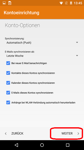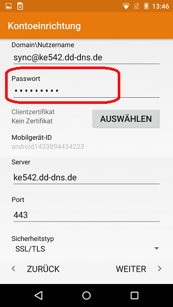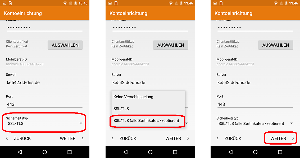 8) Im selben Dialog, scrollen Sie runter und tippen “Sicherheitstyp”. Wählen Sie nun”SSL/TLS (alle Zertifikate akzeptieren)” aus der Dropdown Liste aus (sollten Sie das AkrutoSync Zertifikat importiert haben, können Sie “SSL/TLS” auswählen).