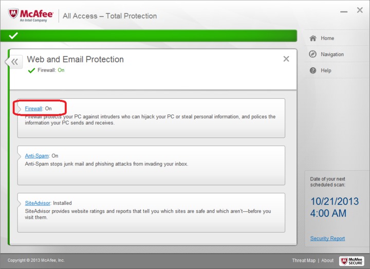 The instructions below show how to configure the McAfee Firewall to unblock Akruto Sync, but can be used to unblock any program that you need to unblock. Click on any screenshot to see a larger version of the screenshot.